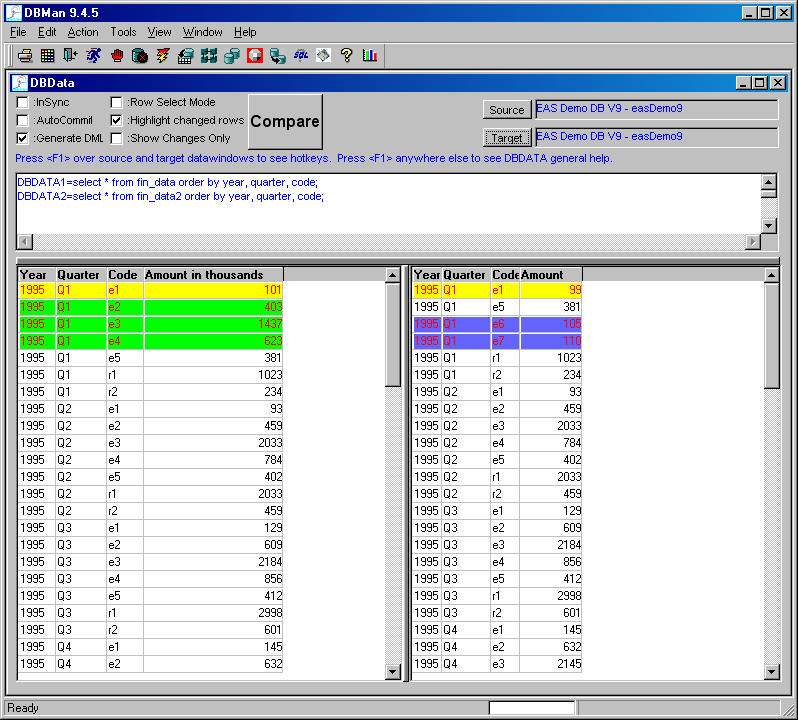 This interface is useful for comparing data between tables in the same database or against different databases. It also can generate DML statements to reflect differences between the source (template) and target (changed template). The procedures are pretty straightforward: