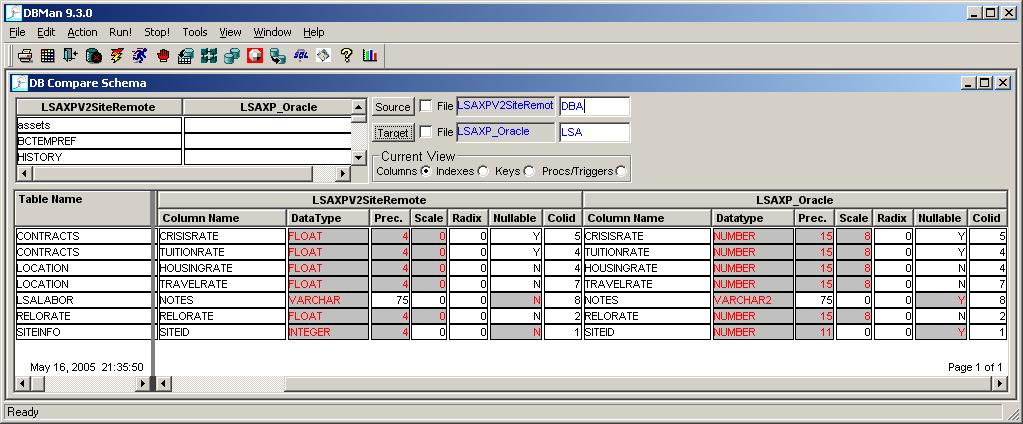 Compares tables, columns, indices, keys, stored procedures, and triggers between databases.