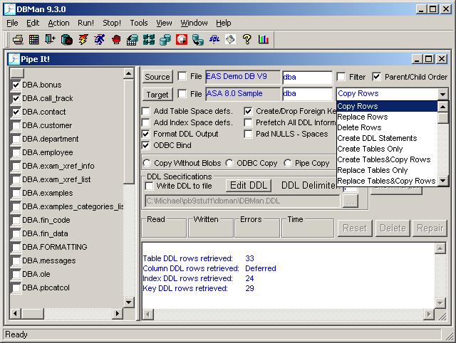 PipeIt is used to move and/or copy DDL or data from one database to another, one schema to another within the same database, file to database, or database to file. It works across all major database vendors: DB2, Oracle, Microsoft SQL Server, ASE, ASA, Postgresql, MySQL.